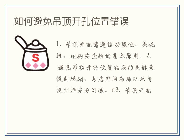 n 为避免吊顶开孔位置错误,以下是一些专业建议: 1. 聘请经验丰富的施工团队。 2. 在施工前要详细审查设计图纸。 3. 在施工过程中要加强现场监管。 总之,避免吊顶开孔位置错误需要综合考虑各种因素,包括功能性、美观性、结构安全性等。通过提前规划、与设计师充分沟通、选择经验丰富的施工团队等方法,可以有效地避免吊顶开孔位置错误,确保吊顶安装的美观与实用。 n n