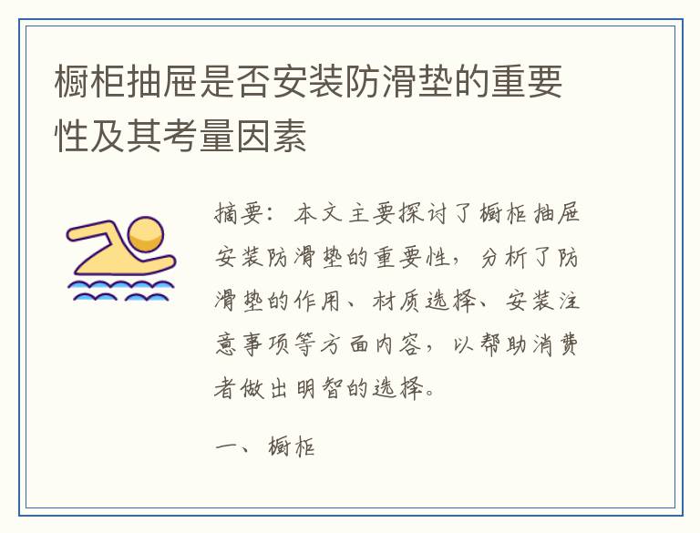 :本文主要探讨了橱柜抽屉安装防滑垫的重要性,分析了防滑垫的作用、材质选择、安装注意事项等方面内容,以帮助消费者做出明智的选择。