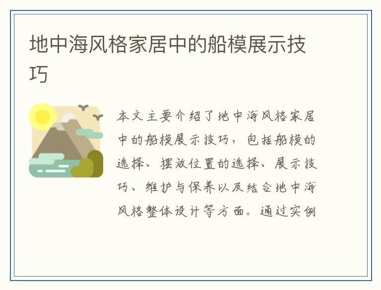 本文主要介绍了地中海风格家居中的船模展示技巧,包括船模的选择、摆放位置的选择、展示技巧、维护与保养以及结合地中海风格整体设计等方面。通过实例分享,展示了船模展示的实际效果。...