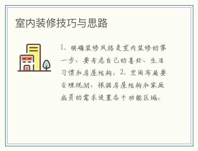1. 确定家居装修风格,为后续设计和选材奠定基础。2. 合理规划空间布局,充分利用每一寸空间。3. 选材时要注重环保和耐用性。4. 照明设计能营造温馨舒适的氛围。5. 色彩搭配让家居环境更和谐统一。6. 细节处理决定空间精致度。7. 家具选购与搭配要协调整体装修风格。8. 合理利用存储空间,保持家居整洁有序。9. 注重施工细节、沟通与工程安全环保问题同等重要。家装修涉及多个方面技巧的综合运用和实践操作,结合自身需求和实际情况巧妙融合形成理想的居住环境。