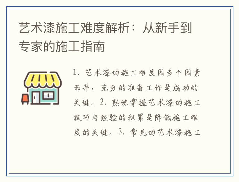 1. 艺术漆的施工难度因多个因素而异,充分的准备工作是成功的关键。2. 熟练掌握艺术漆的施工技巧与经验的积累是降低施工难度的关键。3. 常见的艺术漆施工问题包括起泡、脱落、色差等,提前预防可有效解决。4. 使用专业的工具和辅助材料可以提高艺术漆施工的效率与质量。5. 艺术漆施工并非难事,只要掌握要点,每个人都能创造出美丽的艺术效果。...