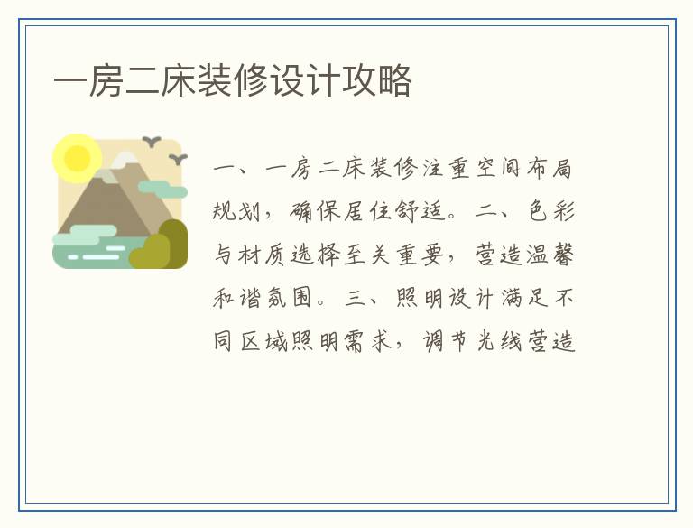一、一房二床装修注重空间布局规划,确保居住舒适。二、色彩与材质选择至关重要,营造温馨和谐氛围。三、照明设计满足不同区域照明需求,调节光线营造舒适环境。四、合理设计收纳和储物空间,实现空间最大化利用。五、装饰与陈设提升空间美感,增添室内生机和温馨感。六、环保与健康考虑选择低甲醛、无污染的家具和建材。...